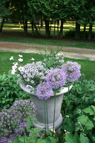 In general I go for brightly colored containers, but I went with soft pastels for the container in center of the garden off the patio. The large glazed ceramic pot that usually lives there took a bad fall this winter and broke into a million pieces so I'm using the elongated urn that held our Christmas tree this winter. It's perhaps a bit formal for the garden, but this whole color scheme is a departure so why not go all the way?
