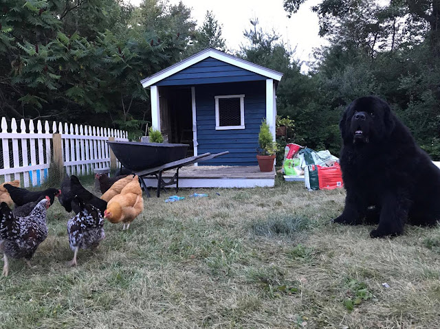 Lucky chickens also have a great guardian, Roisin's Newfoundland Gunner, who take great care of the girls and has made it his mission to make sure they are a happy, egg-laying bunch.